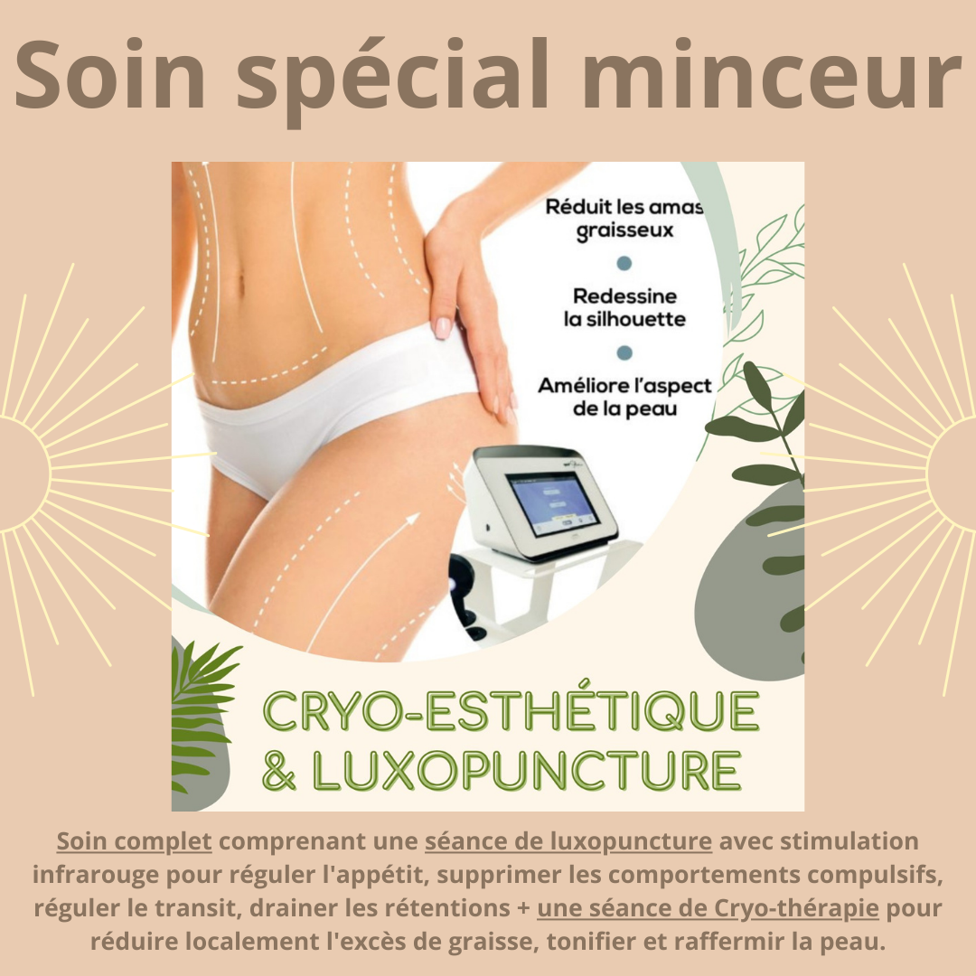Soin complet comprenant une séance de luxopuncture avec stimulation infrarouge pour réguler l'appétit, supprimer les comportements compulsifs, réguler le transit, drainer les rétentions + une séance de Cryo-thérapie pour réduire localement l'excès de graisse, tonifier et raffermir la peau. #cryotherapie #cryolipolyse #cryoesthetique #luxopuncture #silhouette #amasgraisseux #bourrelet #minceur #bienetre #soinminceur #anticellulite #cellulite #peaudorange #twtoprated2023 #blisssophro #chelles #seineetmarne #iledefrance