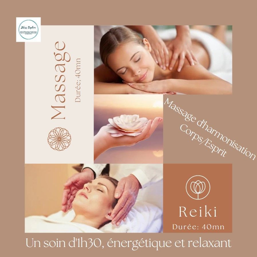 Soin énergétique et relaxant, comprenant 40 mn de massage du haut du corps (Dos, épaules, crâne et visage) + 40 mn de Reiki... pour un rééquilibrage complet !